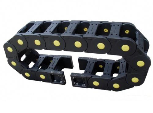 尼龙拖链适用于往复运动的场合,能够对内置电缆、油管、气管等起到牵引和保护的作用。拖链每节都能打开,便于安装和维修。运动时噪音低、耐磨、可高速运动。拖链已被广泛应用于数控机床、电子设备、石材机械、玻璃机械、门窗机械、注塑机、机械手、起重运输设备、自动化仓库等。