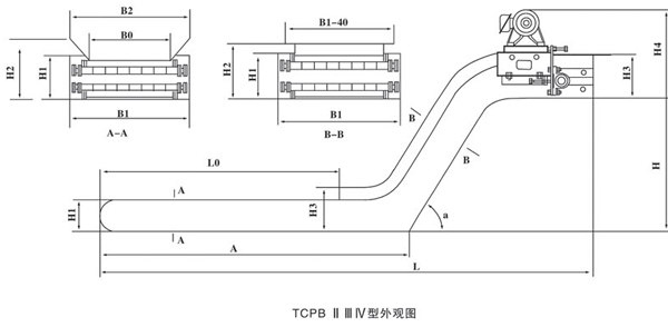 TCPB系列链板排屑机按结构尺寸分为(I、II、III、IV)四种基本类型,其中I、II两种型号的传动链条为C210AL型,节距50.80mm,单排极限拉伸载荷55.6KN,I、II型外型美观、紧凑适用于小型主机;III、IV型结构更加牢固可靠,适用于大中型主机及生产线上的远距离输送。每个基本类型中机器的各部尺寸均可按主机的要求柔性设计,以达到最佳的配置效果。