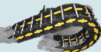 (3)单元链节由左右链板和上下盖板组成,拖链每节都能打开,装拆方便,不必穿线,打开盖板后即可把电缆、油管、气管、水管等放入拖链。