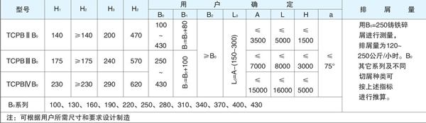 TCPB系列链板排屑机按结构尺寸分为(I、II、III、IV)四种基本类型,其中I、II两种型号的传动链条为C210AL型,节距50.80mm,单排极限拉伸载荷55.6KN,I、II型外型美观、紧凑适用于小型主机;III、IV型结构更加牢固可靠,适用于大中型主机及生产线上的远距离输送。每个基本类型中机器的各部尺寸均可按主机的要求柔性设计,以达到最佳的配置效果。